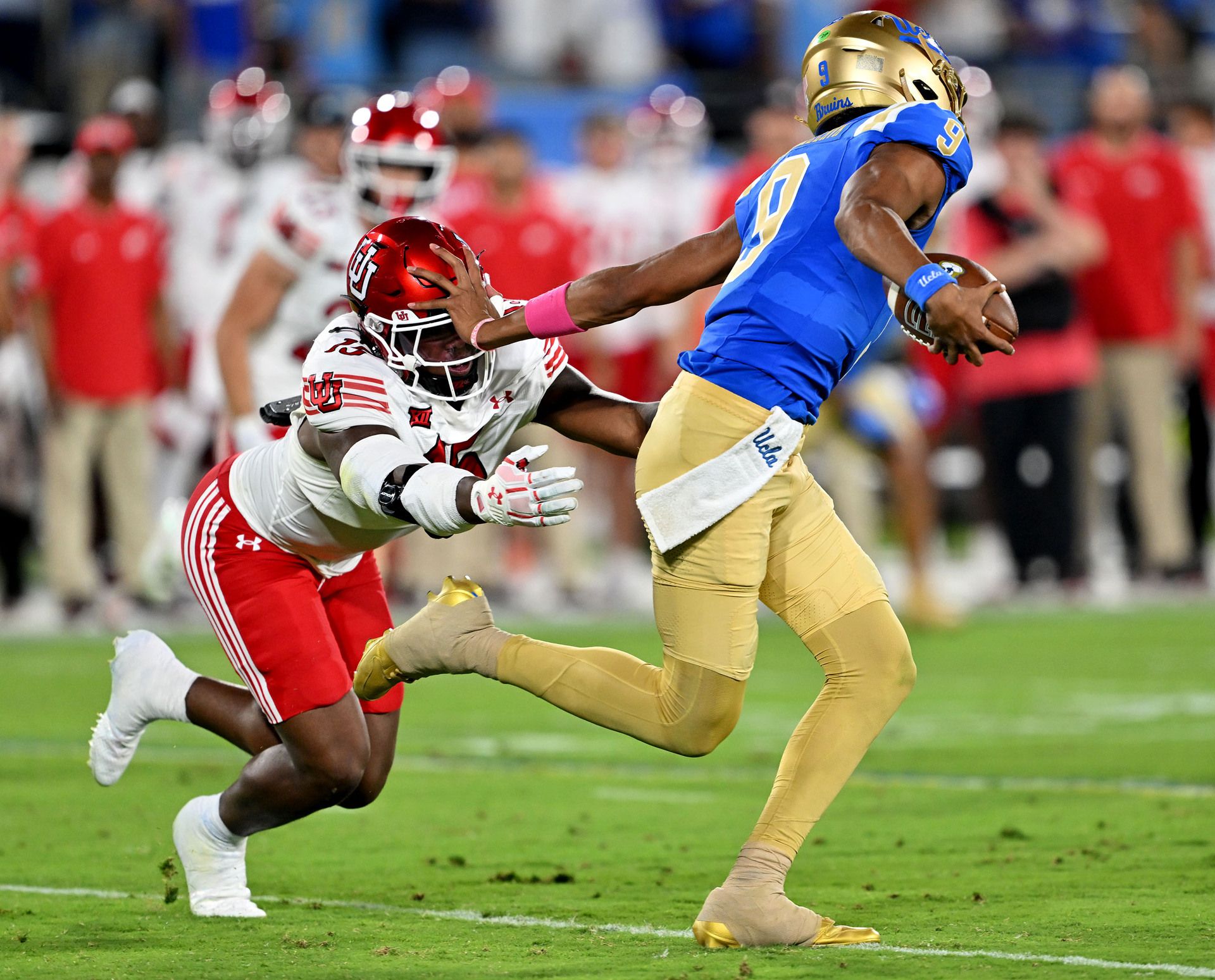 Utah Utes defensive end Lance Holtzclaw (15) gets stiff-armed by UCLA Bruins quarterback Nico Iamaleava (9) as they play at the Rose Bowl in Pasadena, Calif., on Saturday, Aug. 30, 2025. (Scott G Winterton, Deseret News)