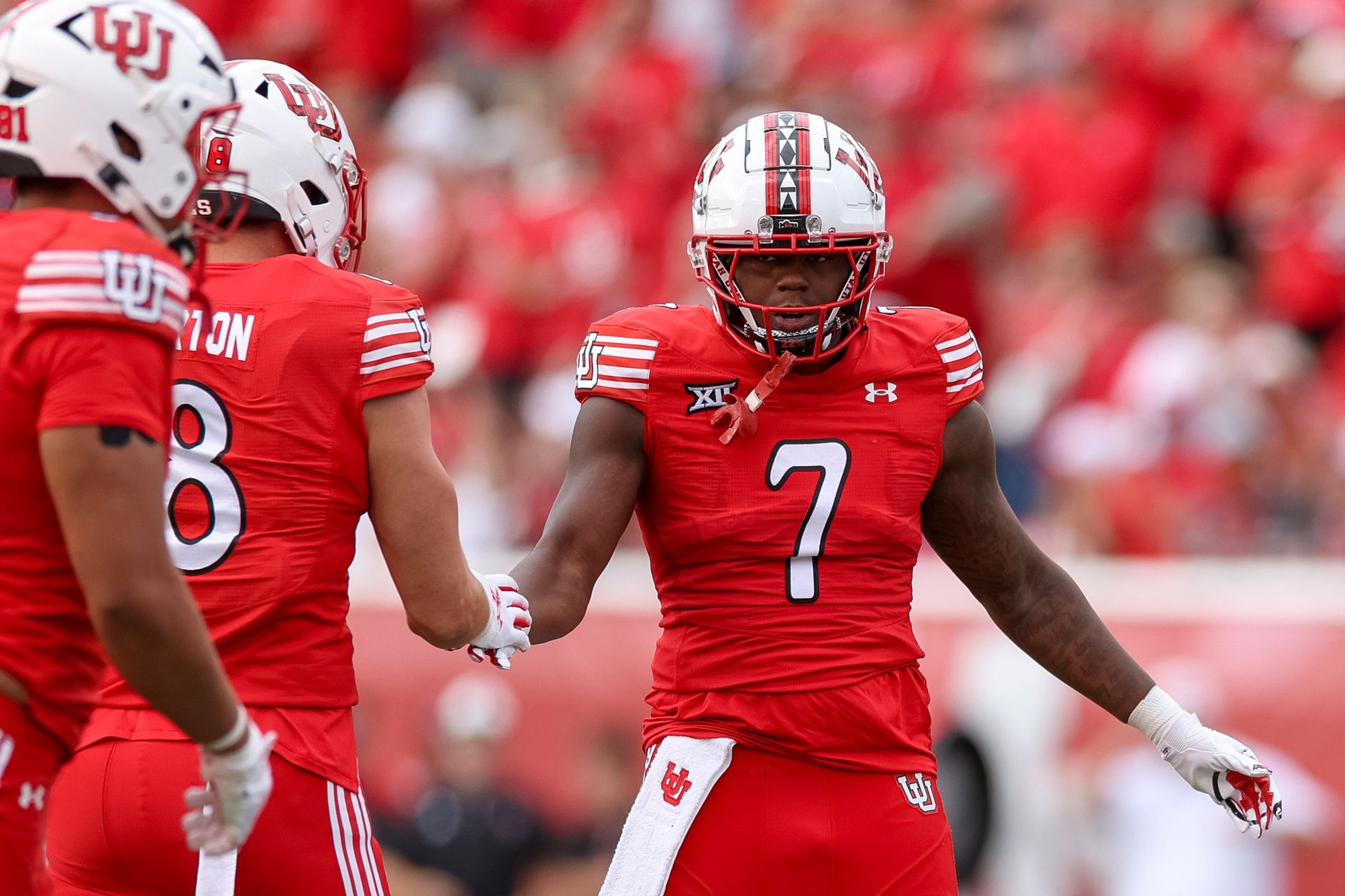 Utah Utes linebacker Johnathan Hall (7) reacts after the play during the first half of the game against the Texas Tech Red Raiders at Rice-Eccles Stadium in Salt Lake City on Saturday, Sept. 20, 2025. (Rio Giancarlo, Deseret News)