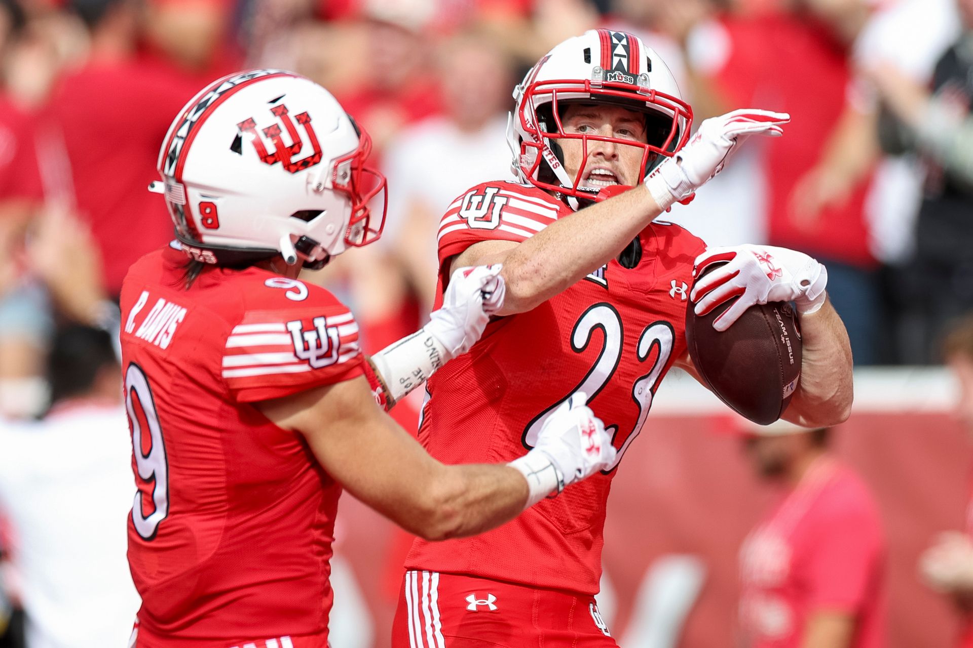 Utah Utes wide receiver Jackson Bennee (23) celebrates after a long catch during the first half of the game against the Texas Tech Red Raiders at Rice-Eccles Stadium in Salt Lake City on Saturday, Sept. 20, 2025. The play was called back for a penalty. (Rio Giancarlo, Deseret News)